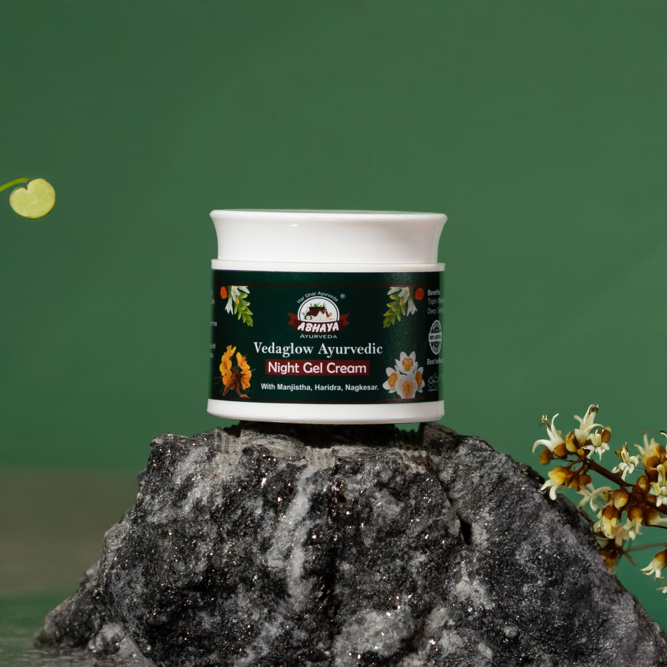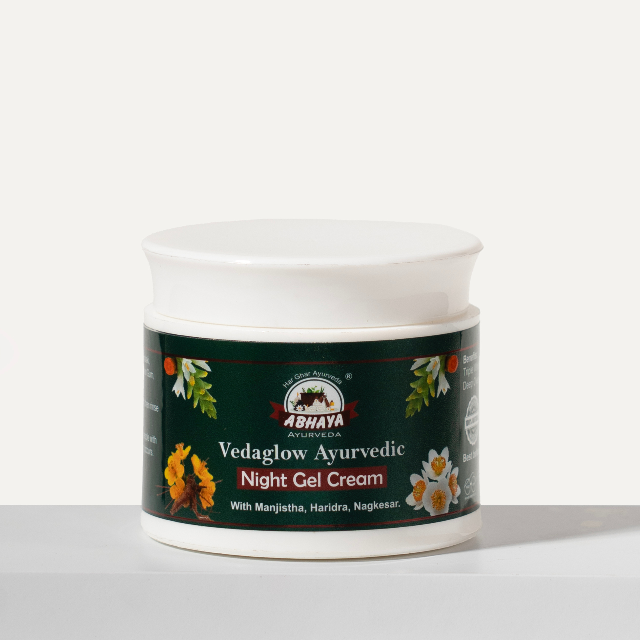 Abhaya Ayurveda’s Vedaglow Ayurvedic Night Gel Cream is a gentle yet powerful herbal formulation crafted to work while you sleep, helping your skin heal, hydrate, and glow naturally by morning.